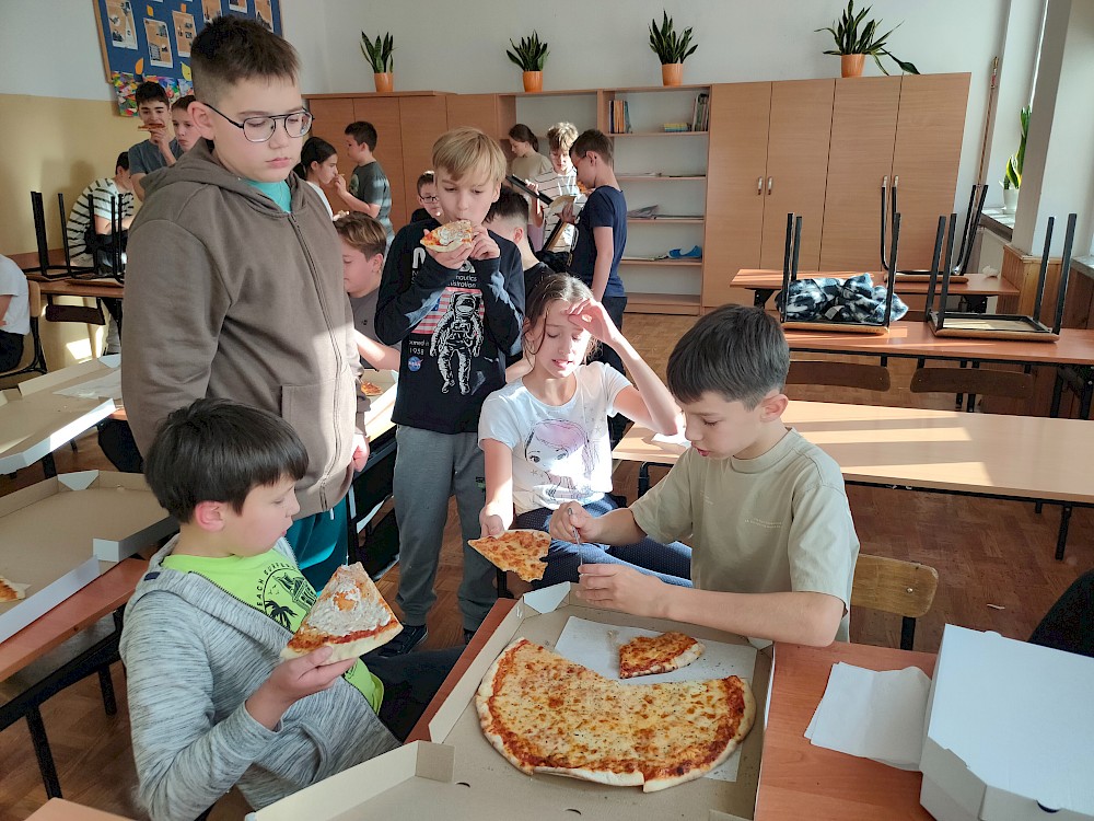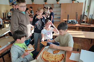 Po intensywnych zmaganiach sportowych wszyscy uczestnicy zregenerowali siły przy wspólnej pizzy, która stała się miłym przerywnikiem w pełnym atrakcji dniu.