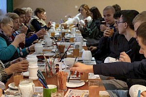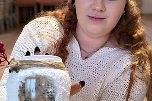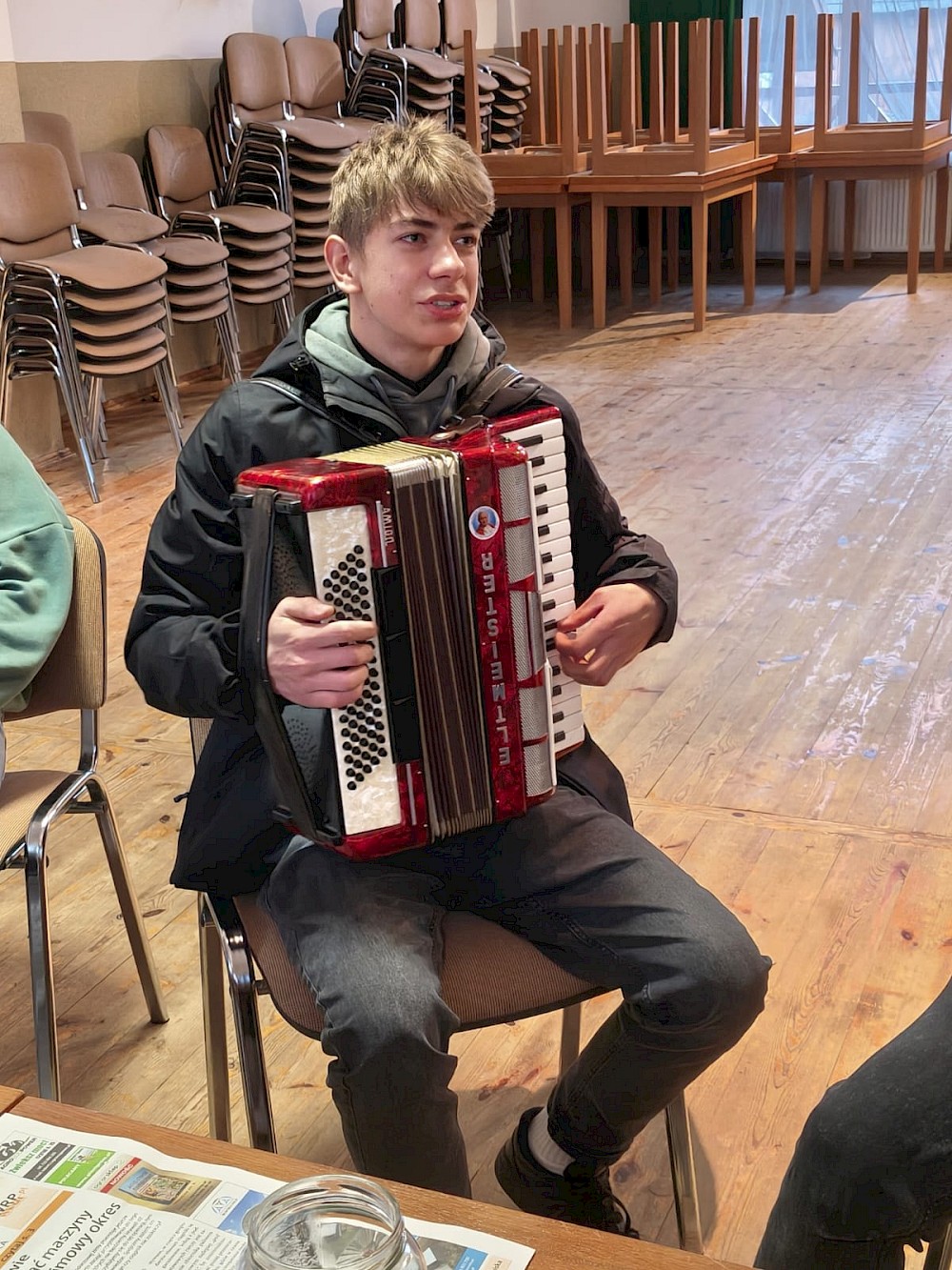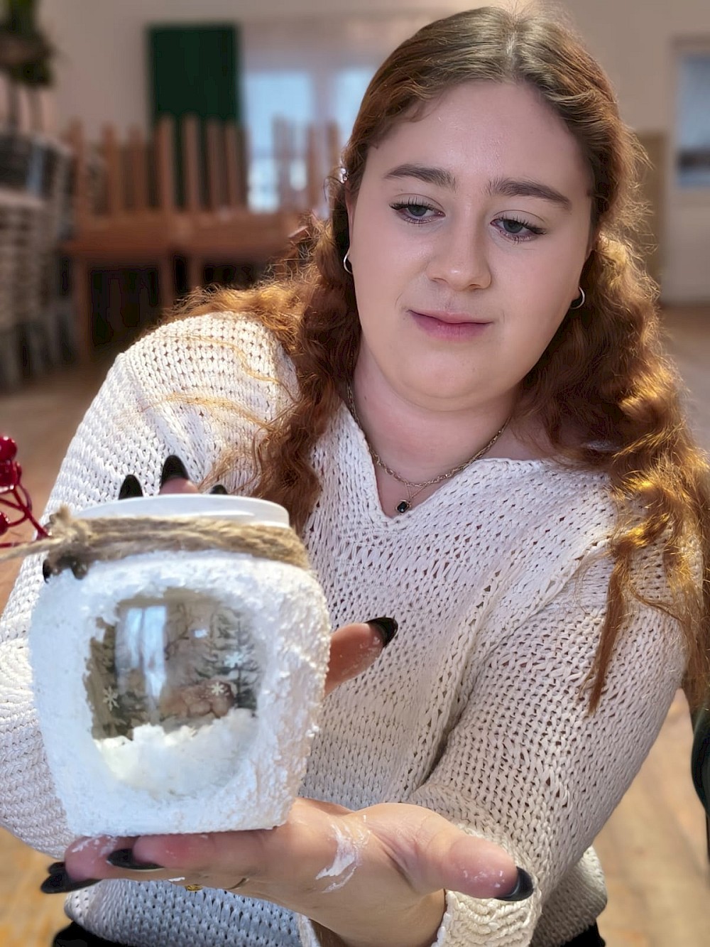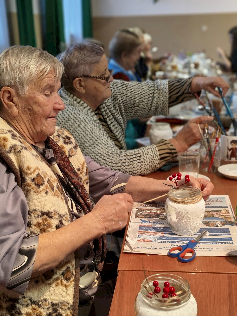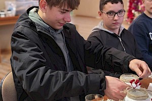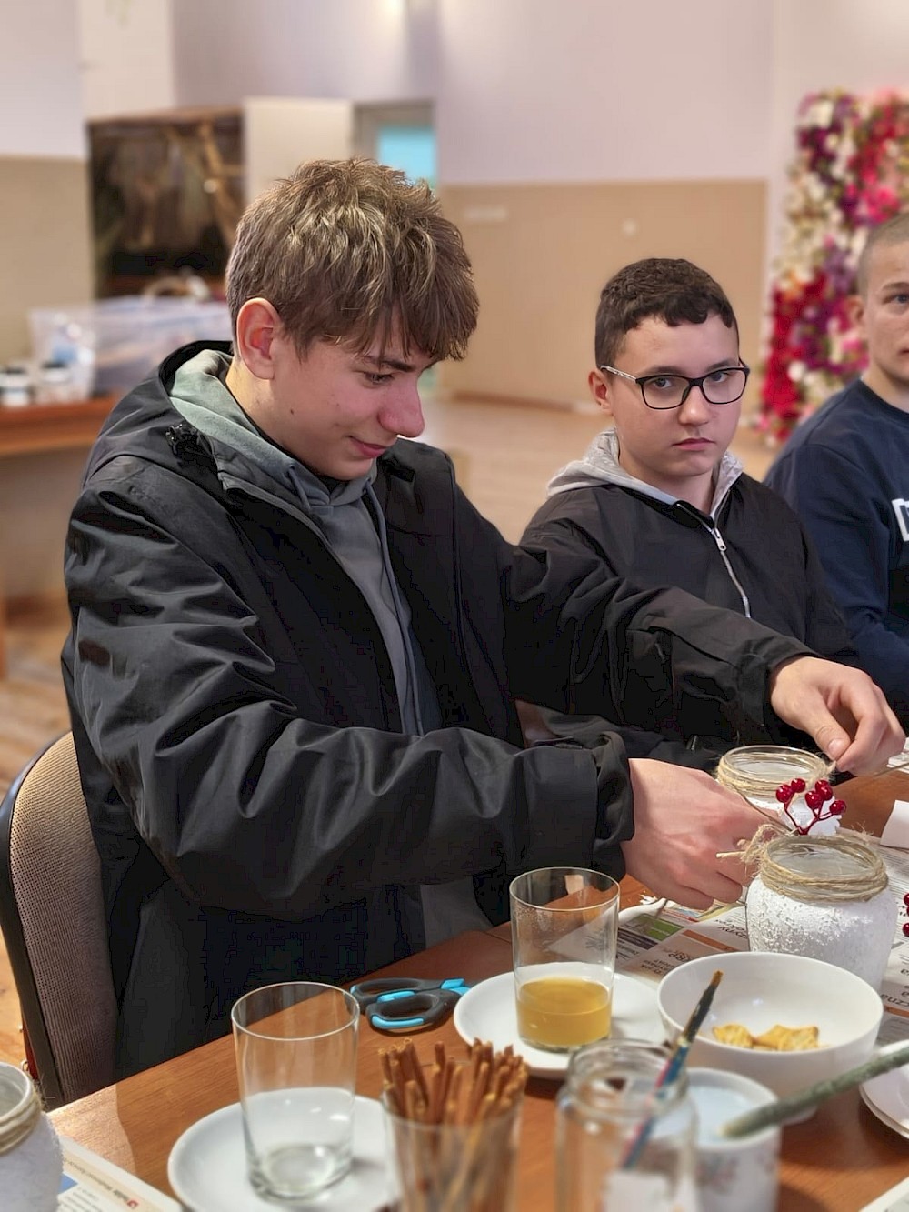 W ramach warsztatów uczestnicy – młodsi i starsi – wspólnie przygotowali piękne świeczniki, pracując ramię w ramię i ucząc się od siebie nawzajem. Nie zabrakło także muzyki! Jeden z uczniów, Szymon, zadbał o oprawę muzyczną, rozśpiewując całą grupę. Śpiew i radosna atmosfera sprawiły, że spotkanie przebiegło w ciepłej, niemal rodzinnej atmosferze.