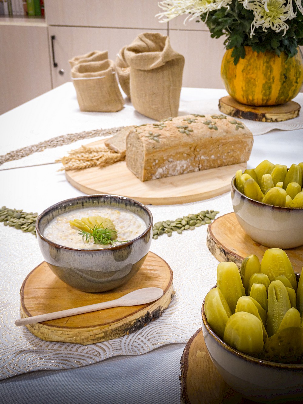 Zwieńczeniem zajęć była degustacja świeżo wypieczonego chleba, podanego z domowym smalcem, przygotowanym wcześniej przez uczniów, oraz kiszonym ogórkiem.