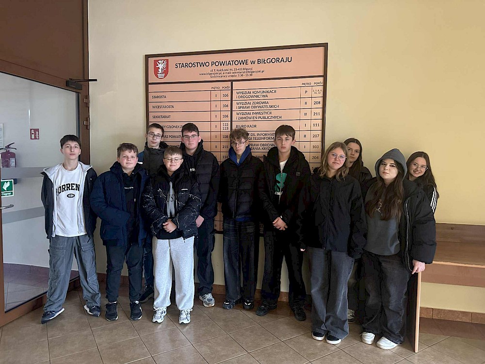 Młodzież odwiedziła dwa kluczowe urzędy w Biłgoraju: Urząd Gminy oraz Starostwo Powiatowe. Spotkania te były okazją do poznania struktury i codziennej pracy instytucji, które na co dzień odpowiadają za funkcjonowanie lokalnej społeczności.
