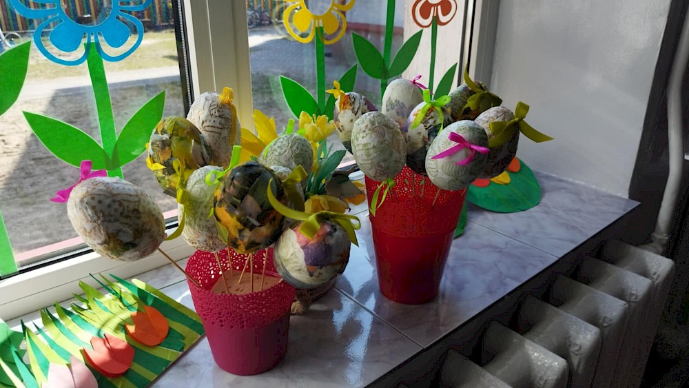 Symbolem nowego życia, odrodzenia i zmartwychwstania są również pisanki, czyli jajka, które są dekorowane różnymi technikami, najczęściej polegającymi na malowaniu lub zdobieniu wzorami. Wolontariusze swoje pisanki tworzyli metodą malowania wzoru woskiem.