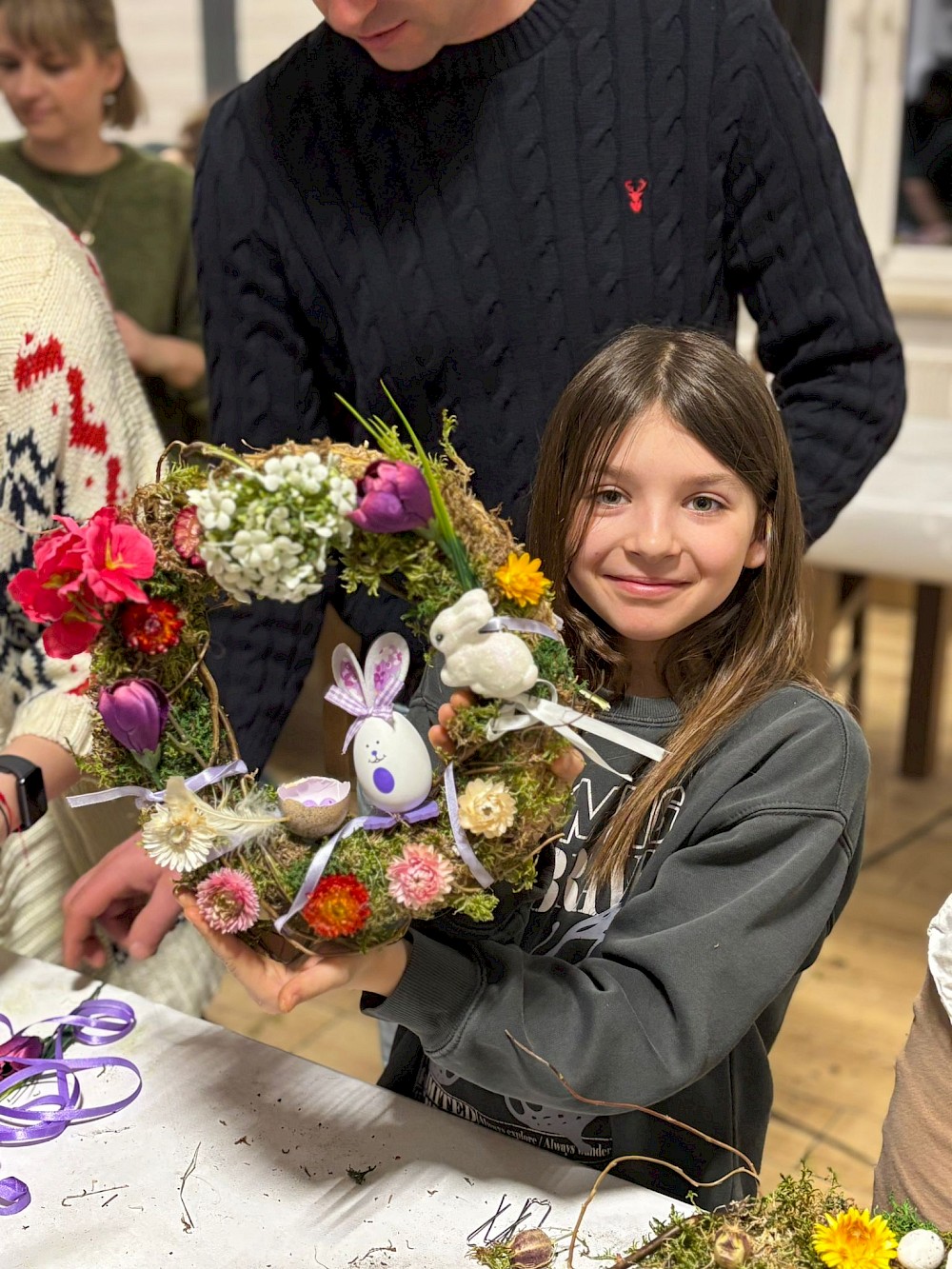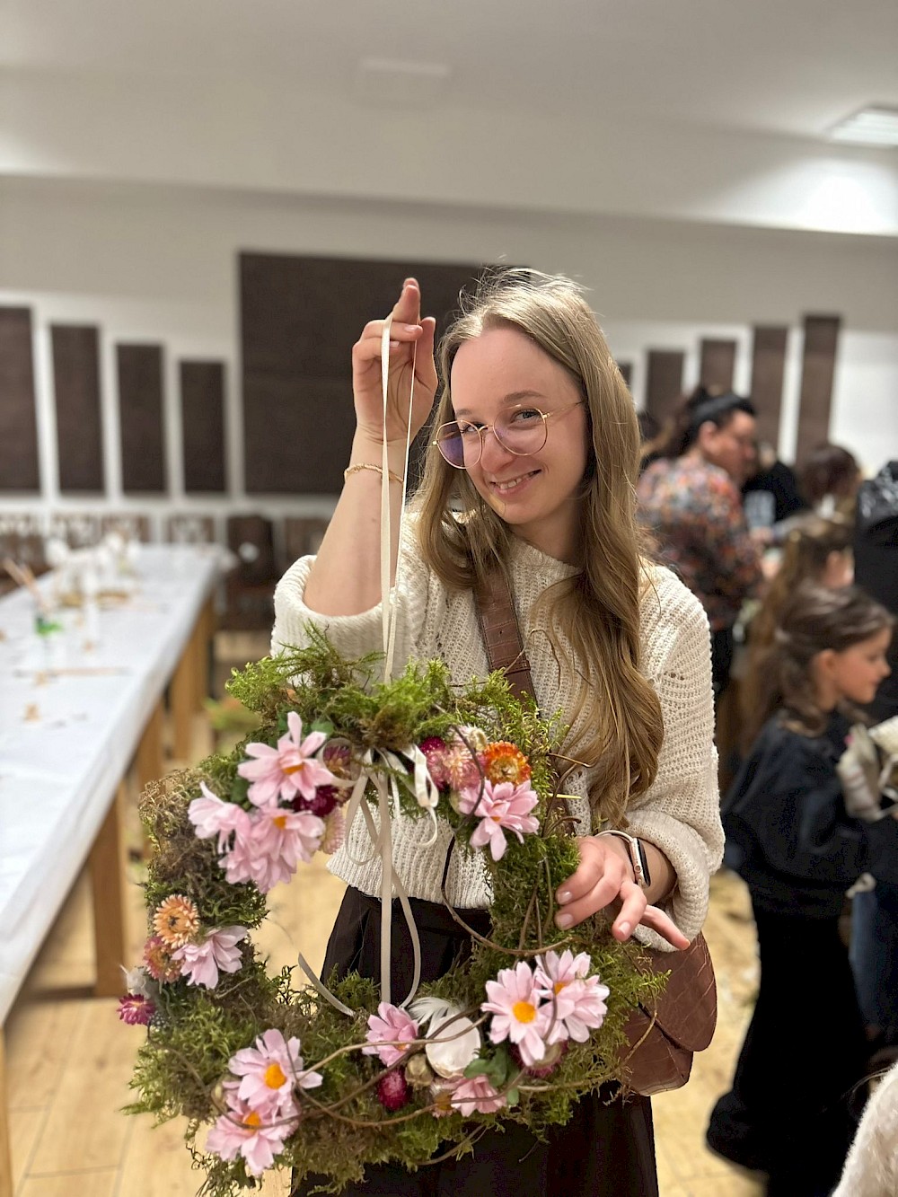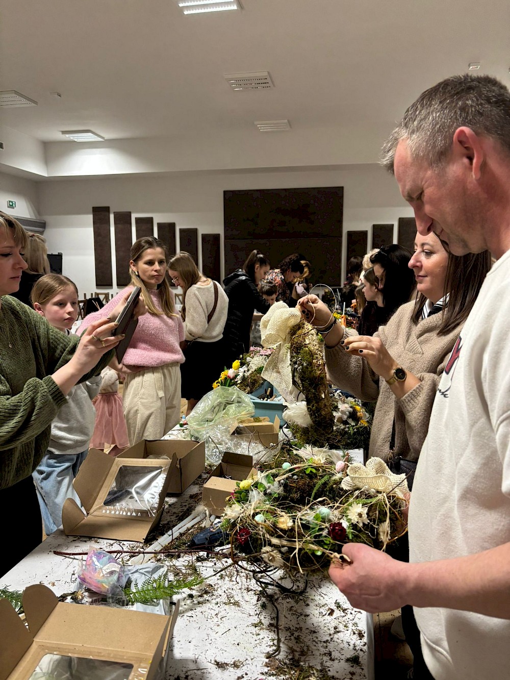 Zajęcia poprowadziła wolontariuszka Kasia Myszak ze „Świata Fantazji”, która z dużym zaangażowaniem dzieliła się swoją wiedzą i umiejętnościami. Uczestnicy mieli okazję poznać różnorodne techniki tworzenia wielkanocnych dekoracji, a także samodzielnie wykonać unikalne wieńce i kolorowe pisanki. Każda praca była wyjątkowa i odzwierciedlała indywidualną kreatywność jej autora.
