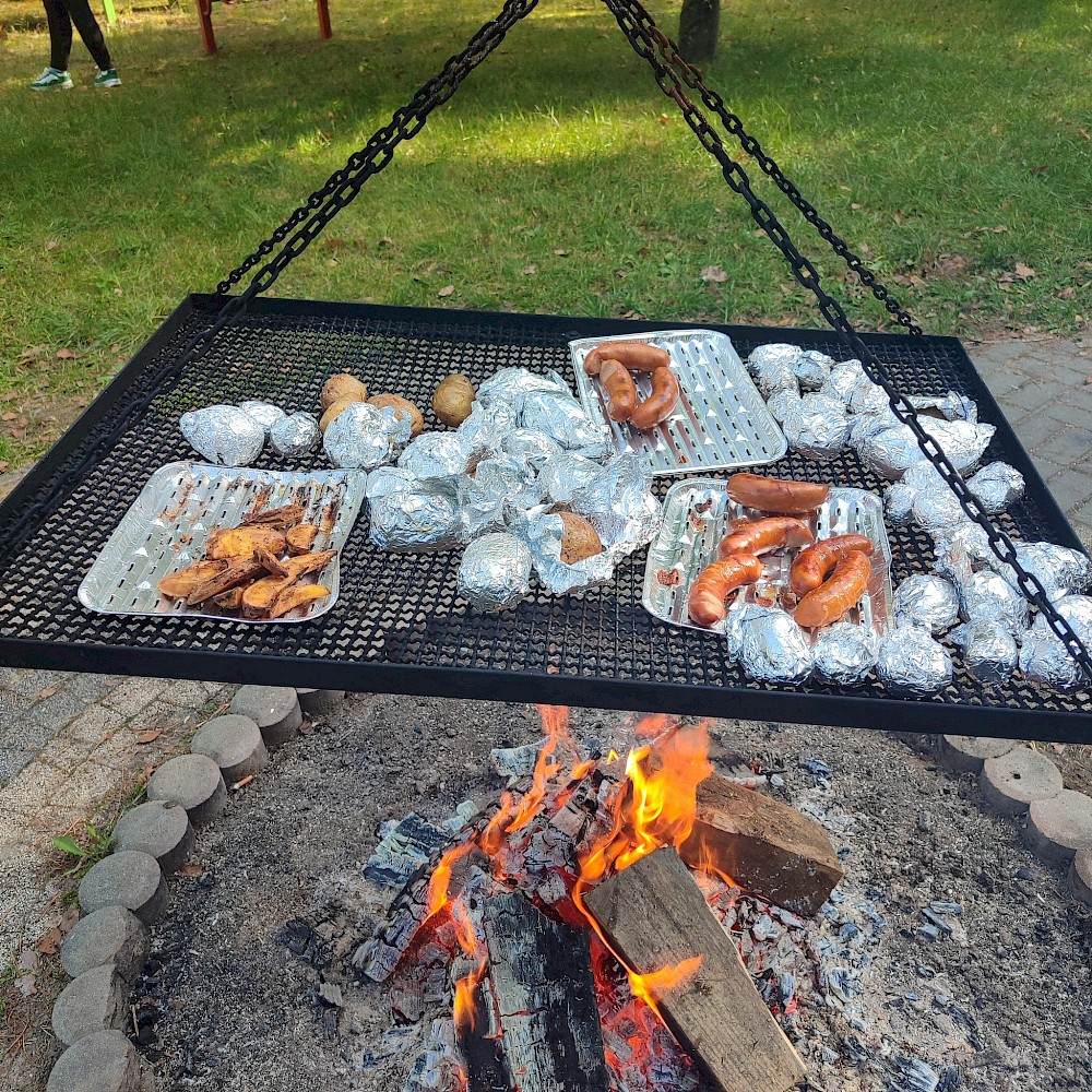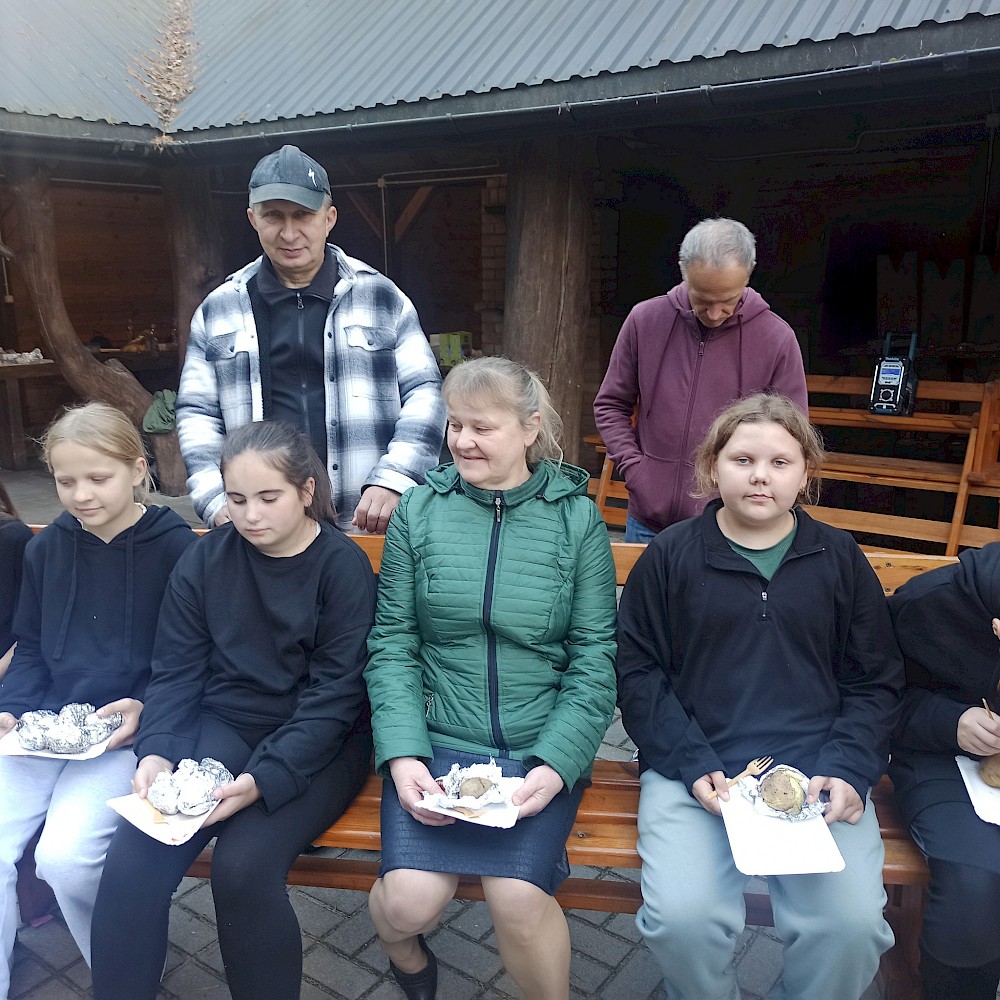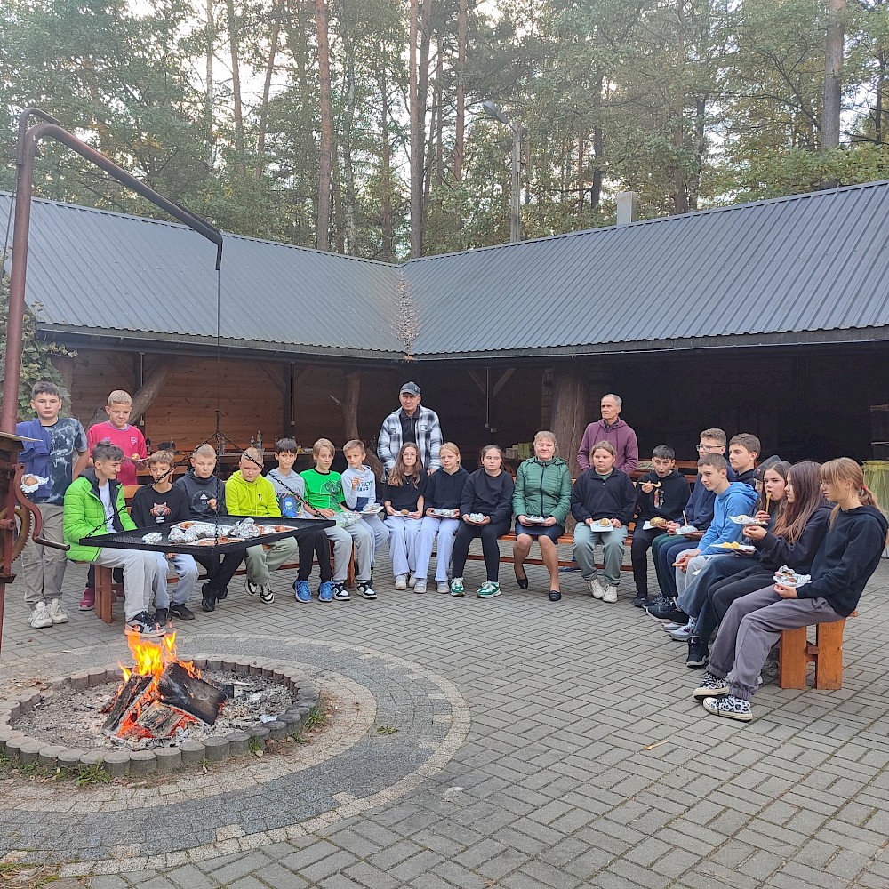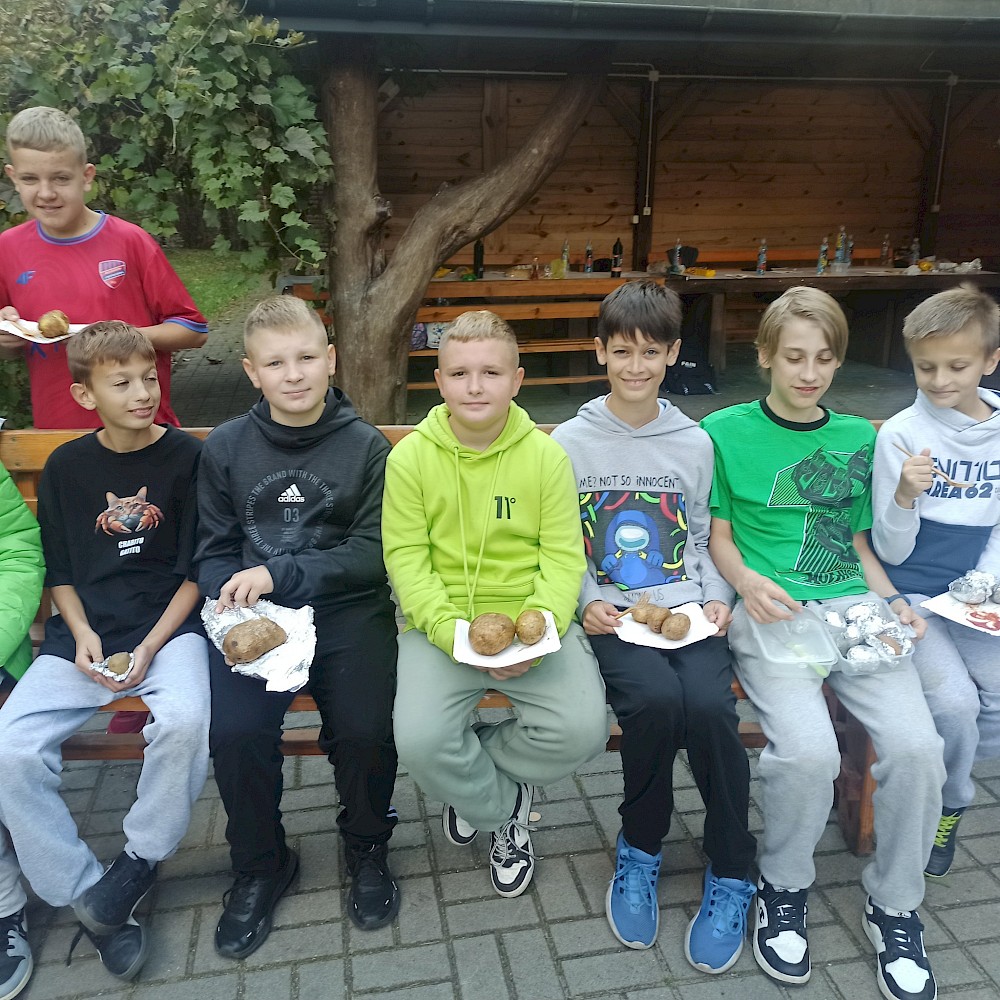 Po zakończonej pracy uczestnicy udali się na przygotowane wcześniej miejsce ogniskowe. Tam czekał na nich zasłużony odpoczynek – wspólne pieczenie ziemniaków i kiełbasek przy ognisku. Oprócz smacznego posiłku nie zabrakło rozmów, śmiechu i wspomnień. Uczniowie dzielili się swoimi wrażeniami, a nauczyciele opowiadali o tym, jak podobne prace wyglądały w ich dzieciństwie. Atmosfera była pełna radości, a jednocześnie refleksji nad tym, jak bardzo zmieniło się życie na wsi i jak ważne jest kultywowanie dawnych tradycji. Dzięki tej inicjatywie młodzież nie tylko zdobyła wiedzę o przeszłości, lecz także zrozumiała wartość pracy, współpracy i szacunku do natury. Spotkanie pokazało, że nawet proste, codzienne czynności mogą być źródłem wspólnoty i okazją do poznawania historii regionu. Uczniowie przekonali się, że tradycje przekazywane z pokolenia na pokolenie mają ogromne