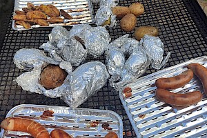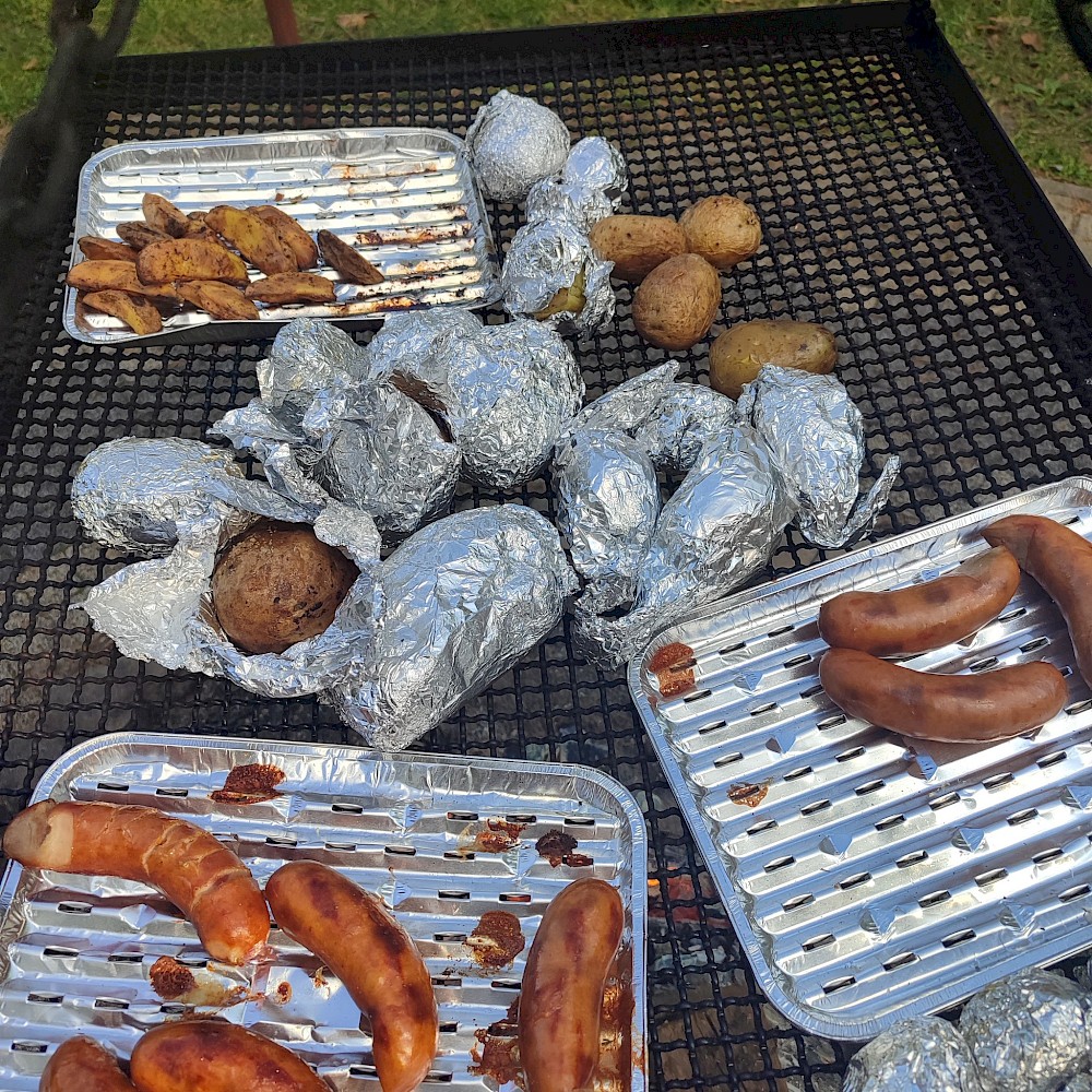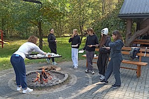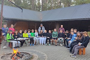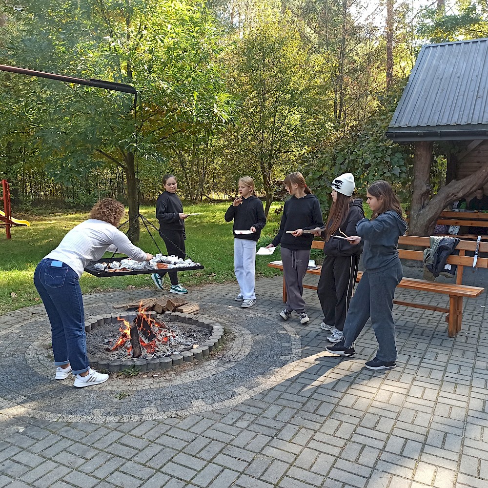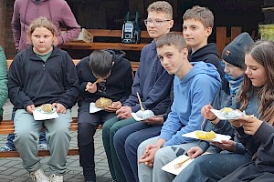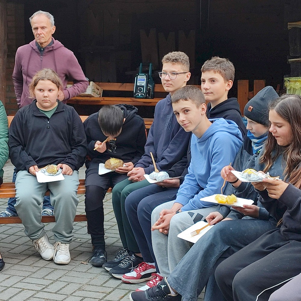 Po zakończonej pracy uczestnicy udali się na przygotowane wcześniej miejsce ogniskowe. Tam czekał na nich zasłużony odpoczynek – wspólne pieczenie ziemniaków i kiełbasek przy ognisku. Oprócz smacznego posiłku nie zabrakło rozmów, śmiechu i wspomnień. Uczniowie dzielili się swoimi wrażeniami, a nauczyciele opowiadali o tym, jak podobne prace wyglądały w ich dzieciństwie. Atmosfera była pełna radości, a jednocześnie refleksji nad tym, jak bardzo zmieniło się życie na wsi i jak ważne jest kultywowanie dawnych tradycji. Dzięki tej inicjatywie młodzież nie tylko zdobyła wiedzę o przeszłości, lecz także zrozumiała wartość pracy, współpracy i szacunku do natury. Spotkanie pokazało, że nawet proste, codzienne czynności mogą być źródłem wspólnoty i okazją do poznawania historii regionu. Uczniowie przekonali się, że tradycje przekazywane z pokolenia na pokolenie mają ogromne