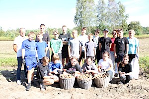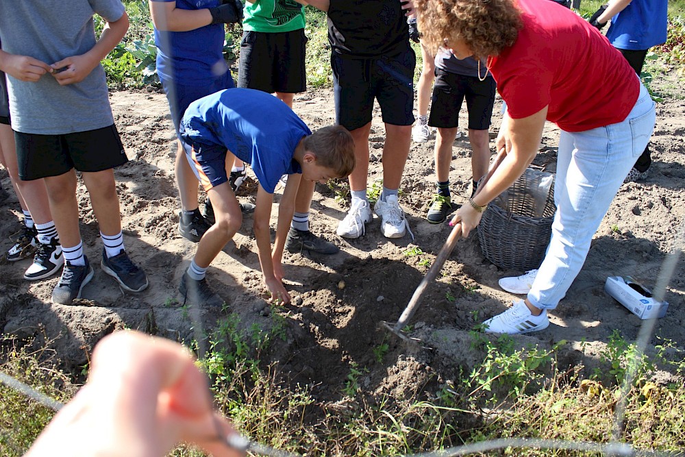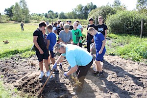 Po krótkim wprowadzeniu przyszedł czas na część praktyczną. Każdy z uczestników mógł samodzielnie spróbować swoich sił przy wykopywaniu ziemniaków. Dla wielu była to pierwsza okazja, by wziąć do ręki motykę i poczuć, jak wiele wysiłku wymagała codzienna praca na roli. Młodzież z entuzjazmem angażowała się w zadania, a współpraca i wzajemna pomoc sprawiły, że praca na polu stała się świetną okazją do integracji i wspólnej zabawy.